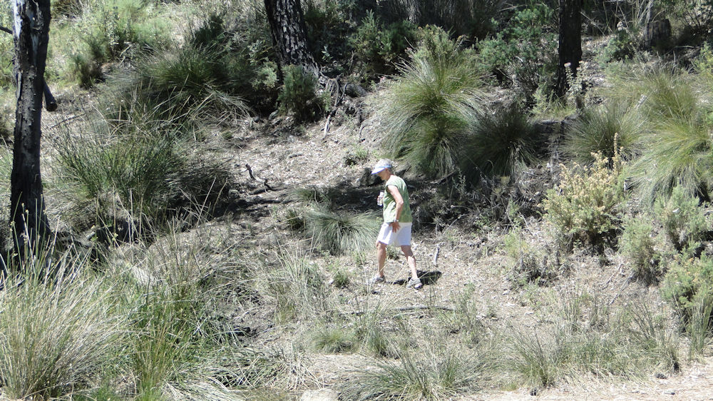 Vi efterlod bilen og gik yderligere nogle km ud af stien. Det blev en dejlig tur. Det var mange udsigtspunkter, og et sted ved en lille bæk så vi vildsvin, der hastede væk. Ved bækken var der spor af mudderhuller, som sikkert var vildsvinenes afkølingssted. Medens vi sad stille på stedet et stykke tid i håb om, at svinene ville vende tilbage, hørte vi en fugl, der kaldte. Vi kunne dog ikke få øje på fuglen, og det viste sig da også, at det var en stor grøn frø - måske en klokkefrø. Vi så også kulsorte humlebier (Xylopa - Tømrerbi?) og en 6-7 cm stor græshoppe.