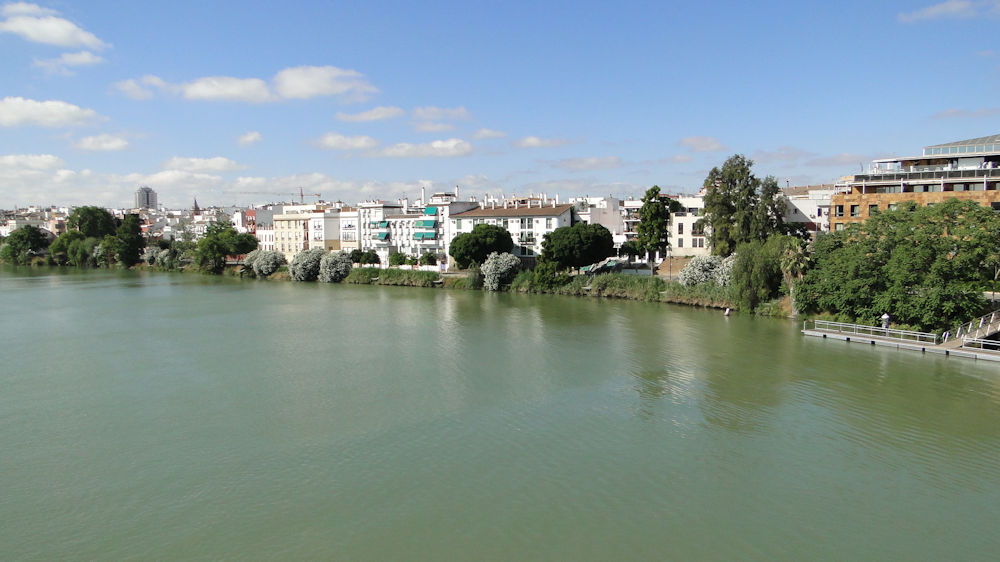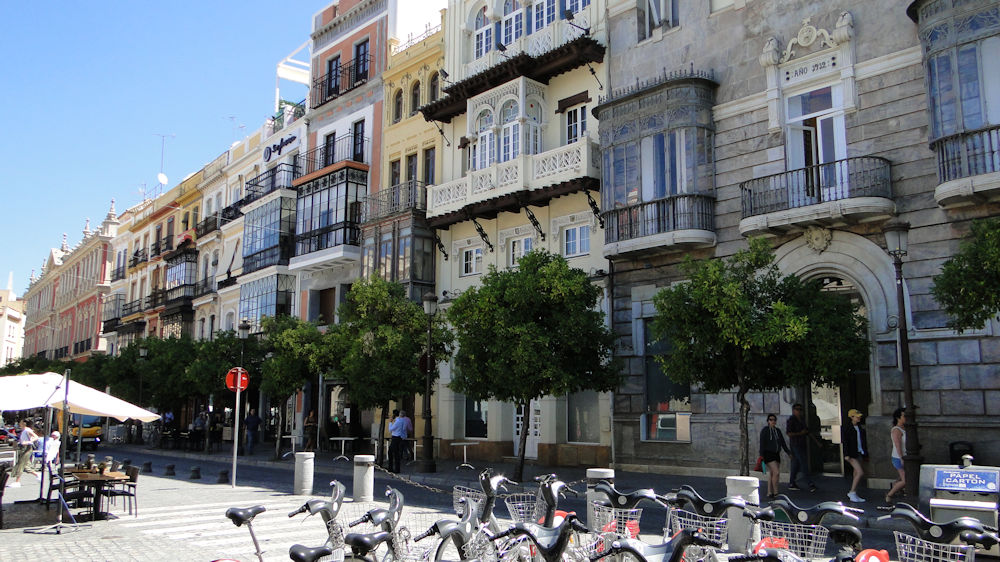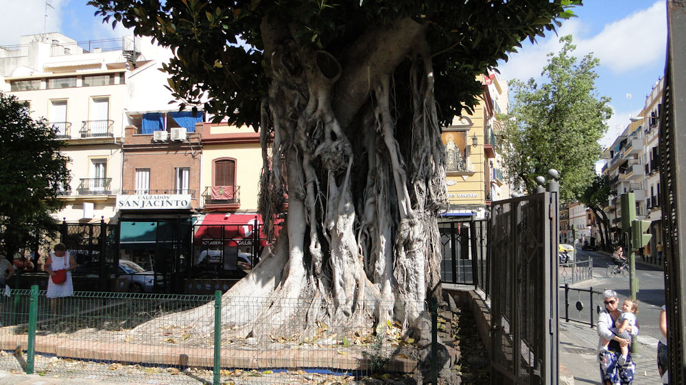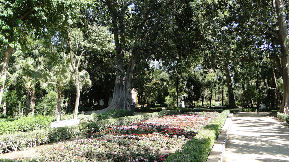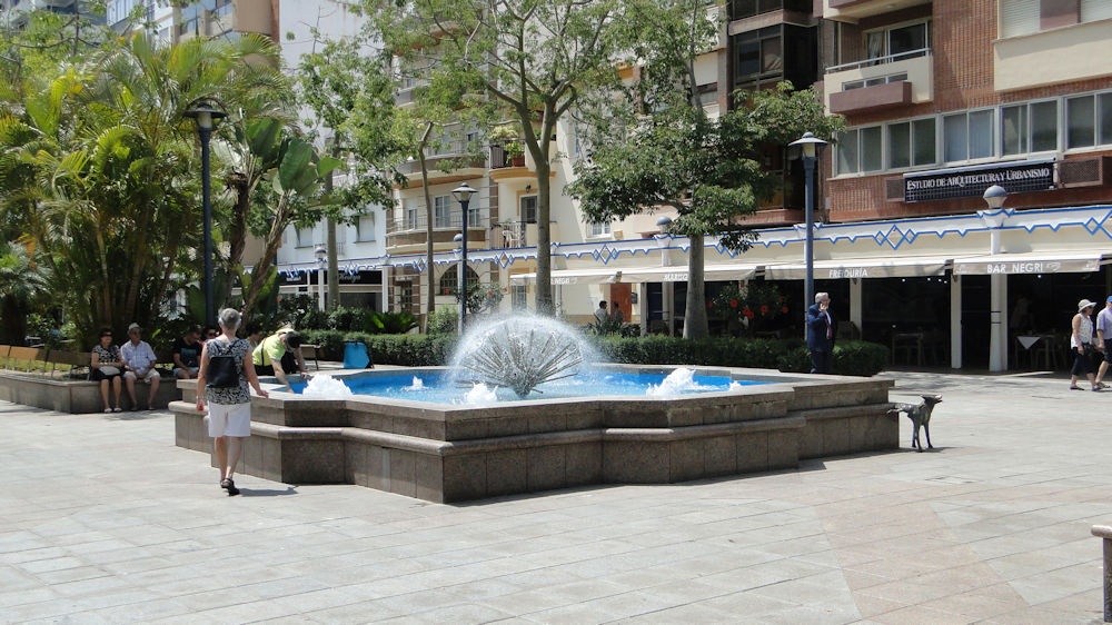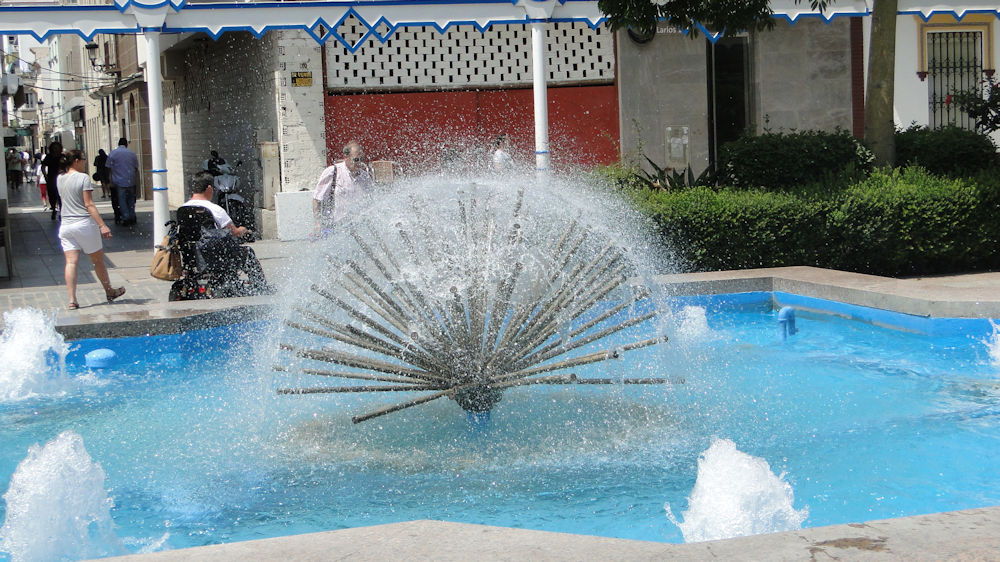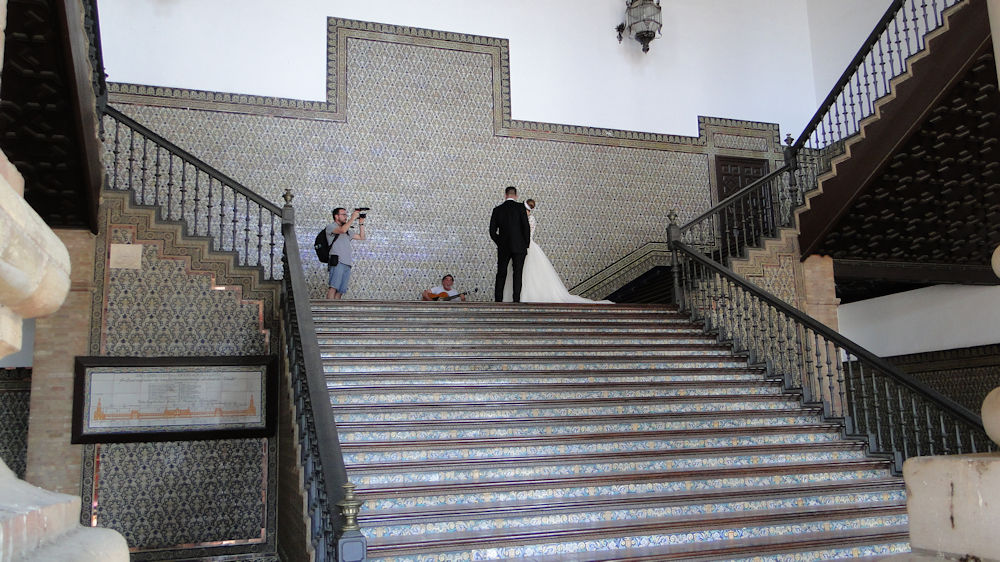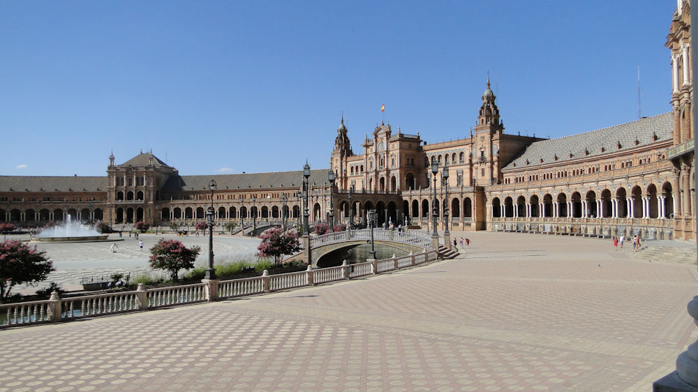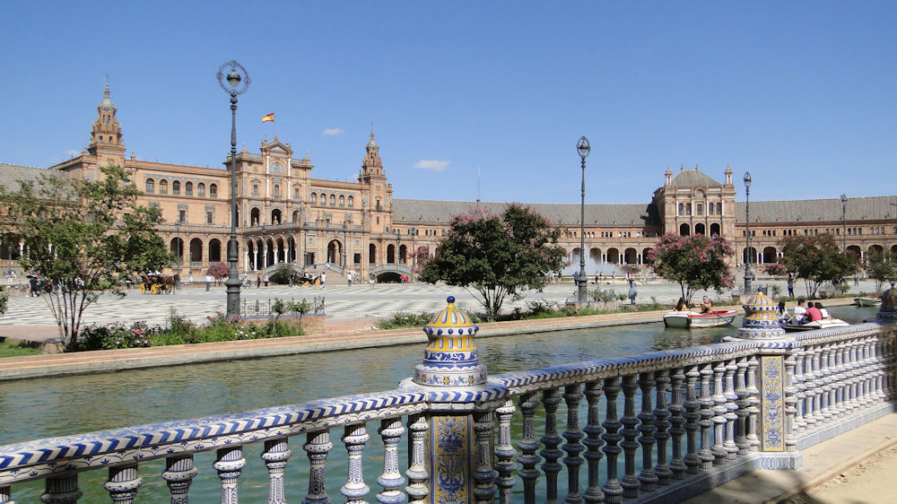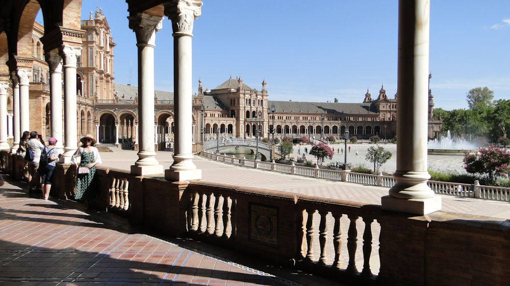 Malet keramik bænke, der hver repræsenterer alle Spaniens provinser, er placeret omkring en rund plads.